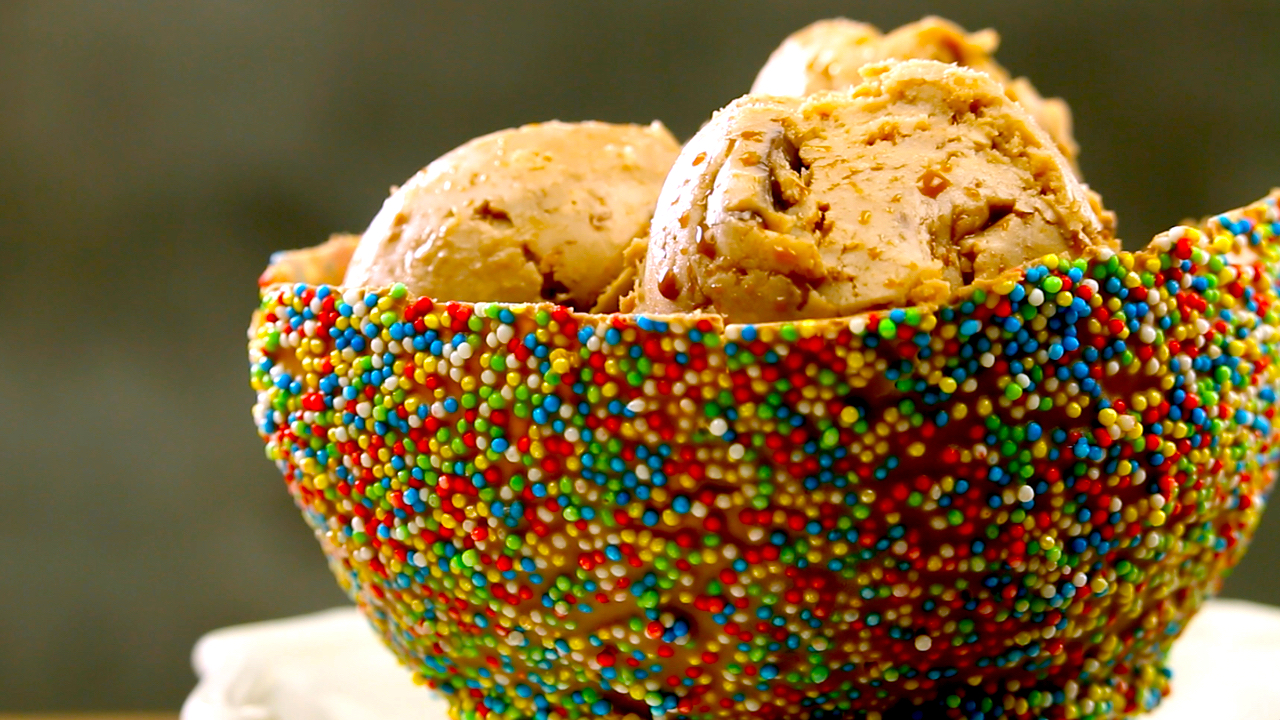 Manchmal hat man mehr Glück, als man für möglich hält. So ähnlich ist es mit dieser süßen Leckerei: Als würde die selbstgezauberte Eiscreme aus Kinderriegeln nicht schon allein überzeugen, nein, sie wird auch noch in einem superwitzigen Schokoschälchen serviert. Und auch das ist selbstverständlich von Hand gemacht. Eine doppelte Portion Glück sozusagen.