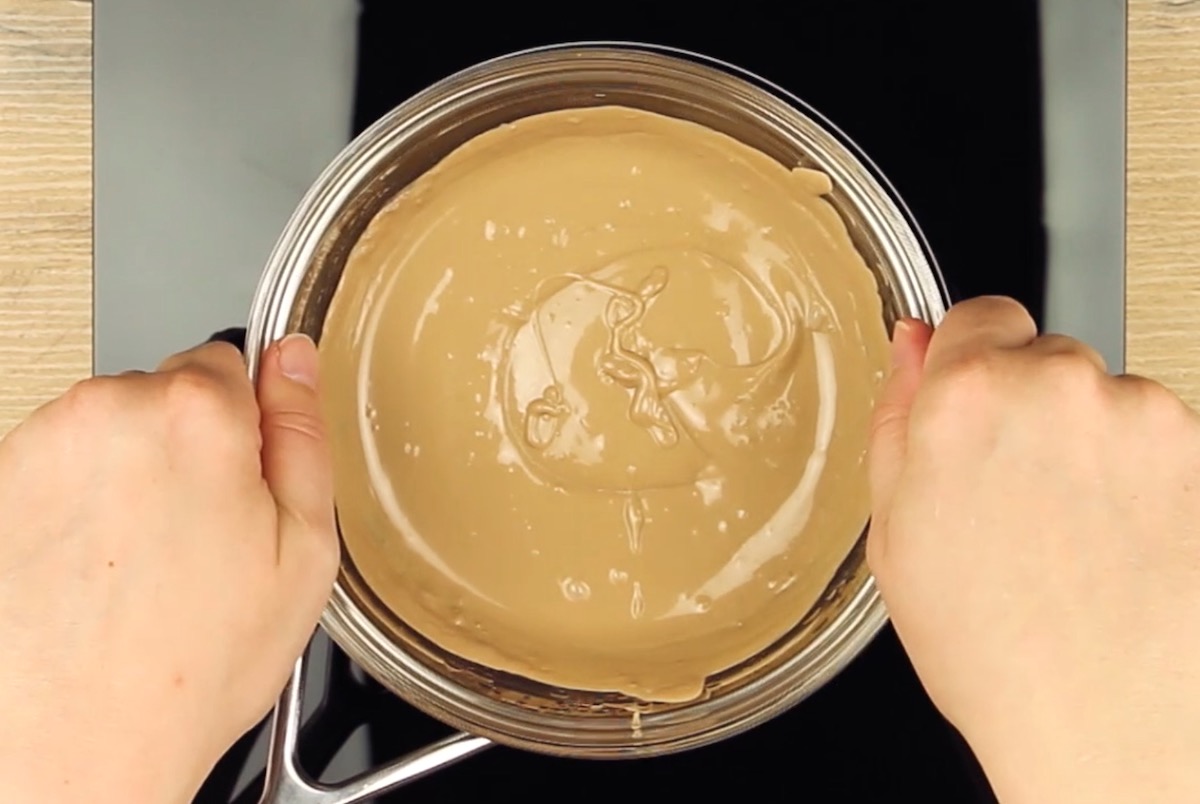 1. Erst musst du 16 Kinderriegel im Wasserbad zum Schmelzen bringen. Achte darauf, dass das Wasser nicht zu stark erhitzt wird, da Schokolade immer nur langsam geschmolzen werden darf. Außerdem sollte die Schüssel nicht das Wasser berühren. Die Schokolade wird praktisch nur vom warmen Wasserdampf geschmolzen.