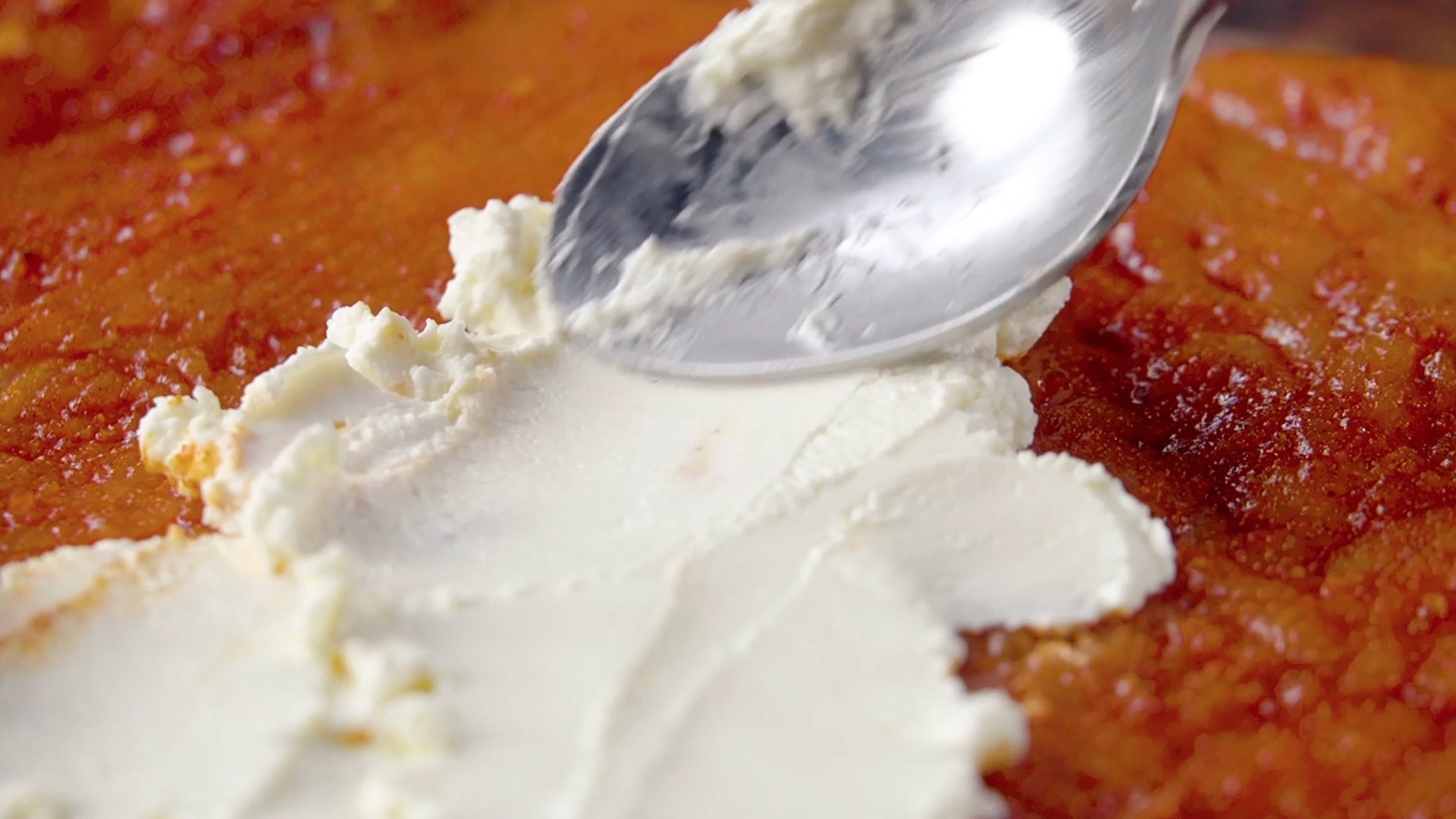 Salze auch diese Schicht und bestreiche sie mit der Marinade und anschließend mit dem Frischkäse. Hierbei solltest du ringsum wieder einen entsprechenden Rand lassen.
