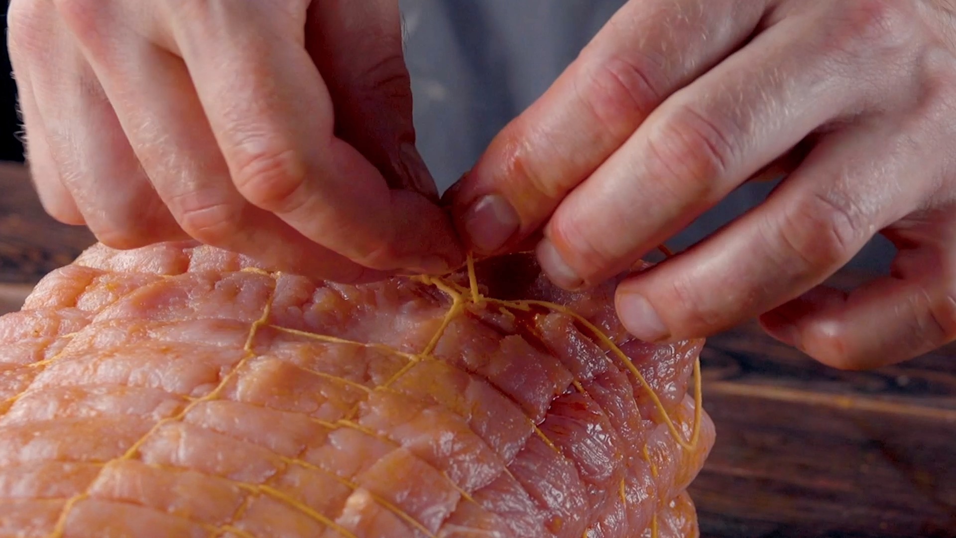 4.) Nun geht es ans Binden: Mache mit einer Bratenschnur an einem Ende oben mittig einen Doppelknoten und fixiere die Schichten, indem du dich mit Schlaufen über die Bratenoberseite zum anderen Ende vorarbeitest. Die Schlaufen sollten einen Abstand von etwa 2 cm haben.