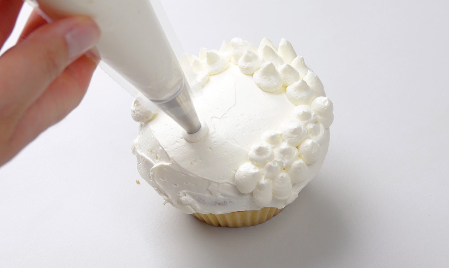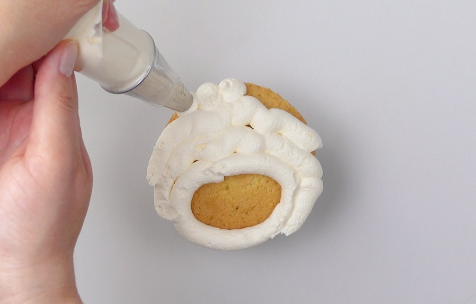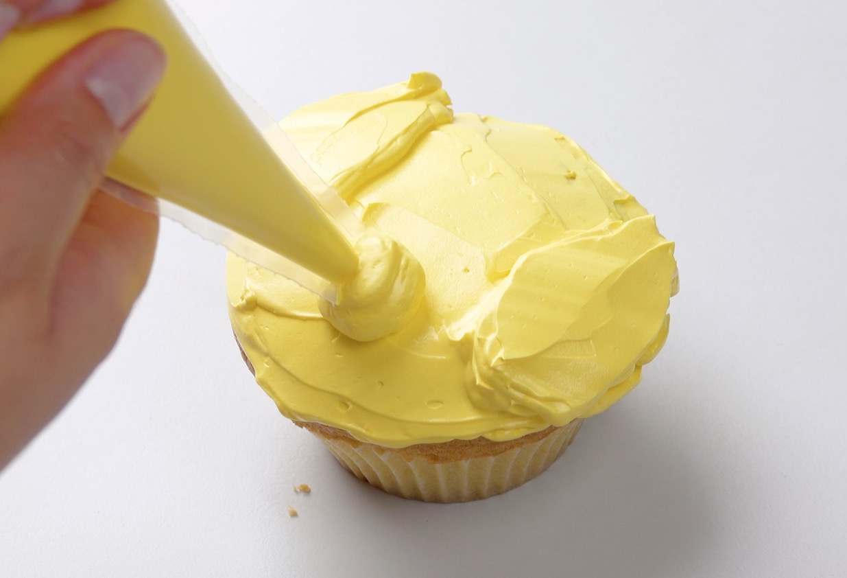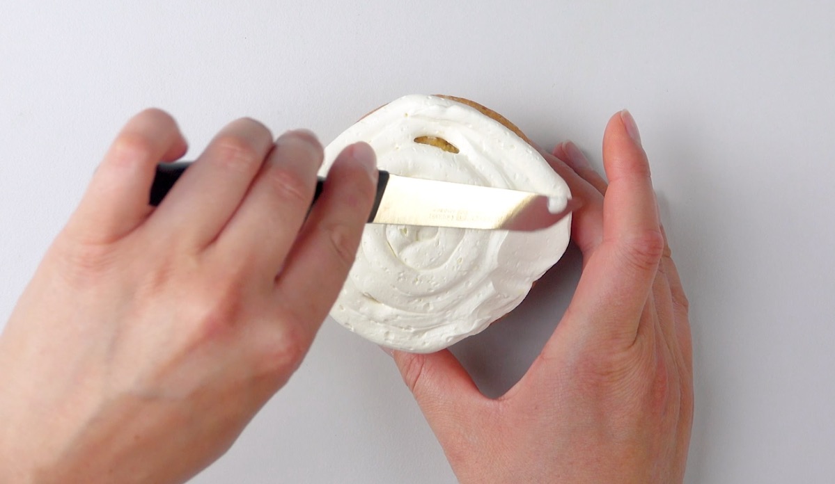 1.) Fülle die Buttercreme in einen Spritzbeutel und spritze sie spiralförmig von innen nach außen auf den Cupcake. Streiche sie dann mit einem Messer glatt.