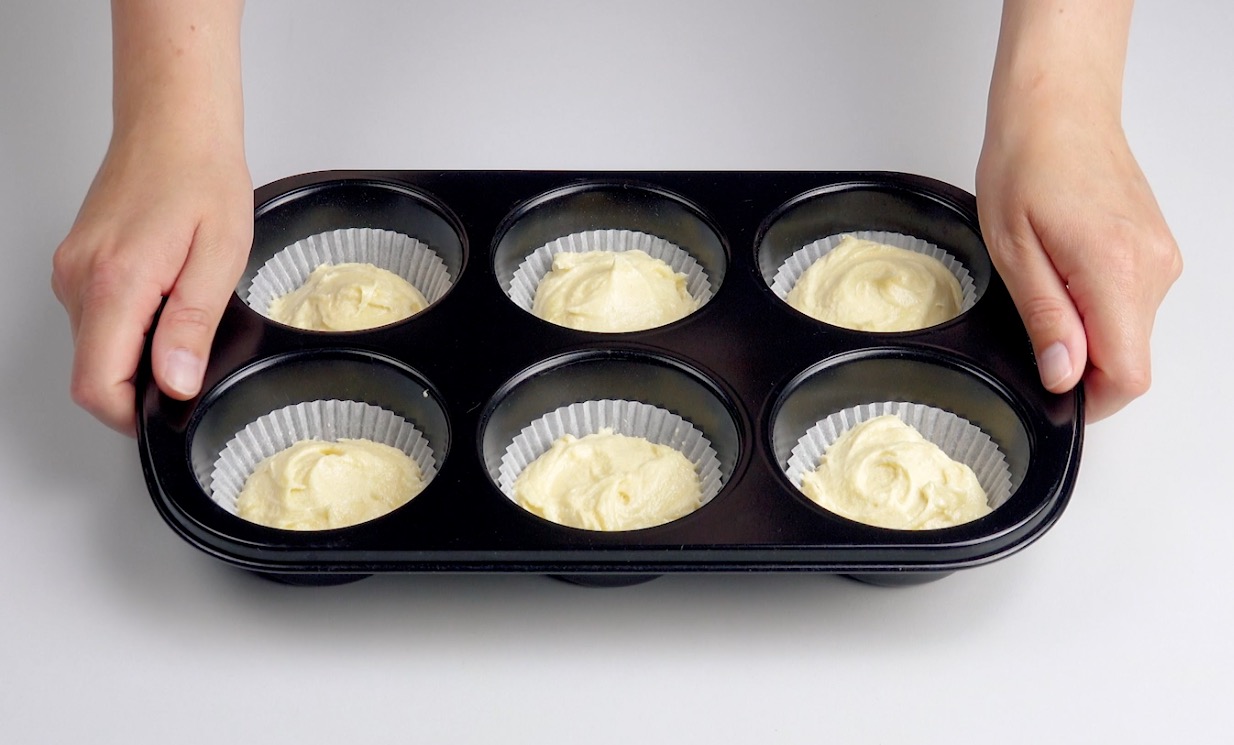 2.) Fülle diesen anschließend in 6 mit Papierförmchen ausgestattete Vertiefungen einer Muffin-Form. Schiebe diese daraufhin in den Ofen: Die Törtchen werden 15 Minuten bei 200 °C im Umluft-Modus gebacken.