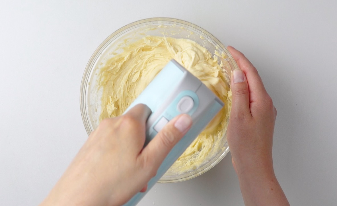 1.) Verrühre zunächst das Mehl, die Butter, den Zucker, die Eier und das Backpulver mit einem Handrührgerät in einer großen Schüssel zu einem glatten Teig.