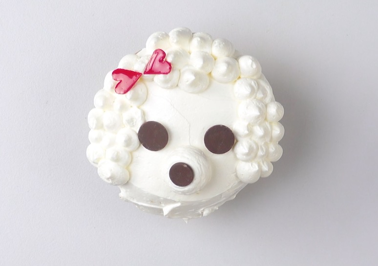 3.) Lege die beiden größeren Drops links und rechts oberhalb der Schnauze als Augen auf die Creme. Auf die Schnauze kommt der kleinere Drop. Schneide dann 2 kleine Herzen aus dem Fondant und setze sie dem Hund vorsichtig als Schleife ins Haar.