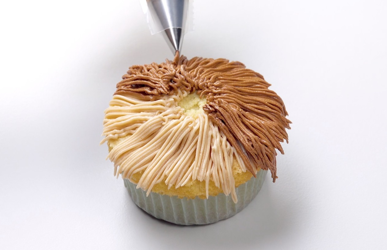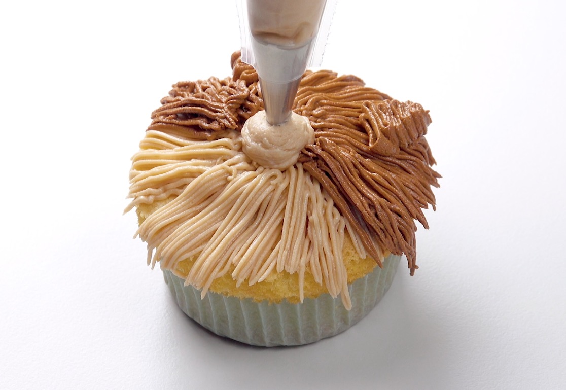 1.) Fülle zwei Spritztüllen mit der hellbraunen und der dunkelbraunen Buttercreme. Verwende jeweils einen „Grashalm“-Aufsatz, um das Fell eines Spitzes nachzuempfinden. Spritze zuerst die helle Creme in Streifen von der Mitte aus nach außen. Sie sollte am Ende die Hälfte des Cupcakes bedecken. Spritze nun die dunkle Creme auf die zweite Hälfte.
