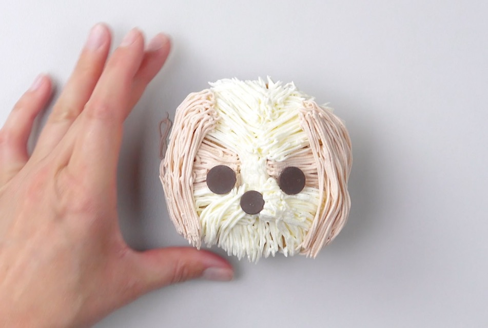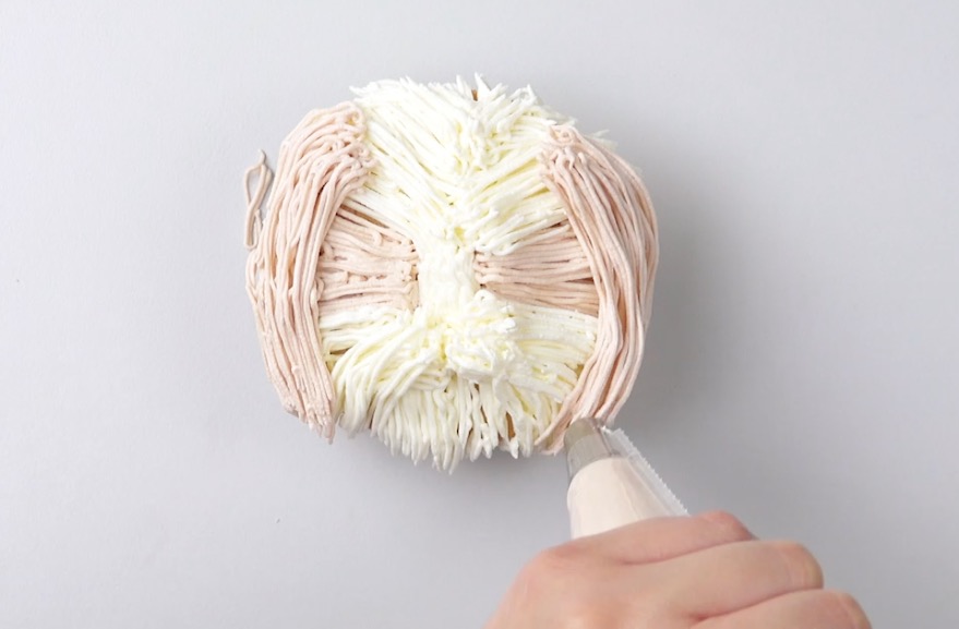 1.) Fülle zwei Spritztüllen mit der weißen und der blassroten Buttercreme. Verwende jeweils einen „Grashalm“-Aufsatz, um das Fell eines Shih Tzus nachzuempfinden. Spritze zuerst die blassrote Creme in zwei gegenüberliegenden Dreiecken von der Mitte aus nach außen.