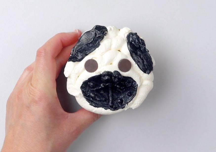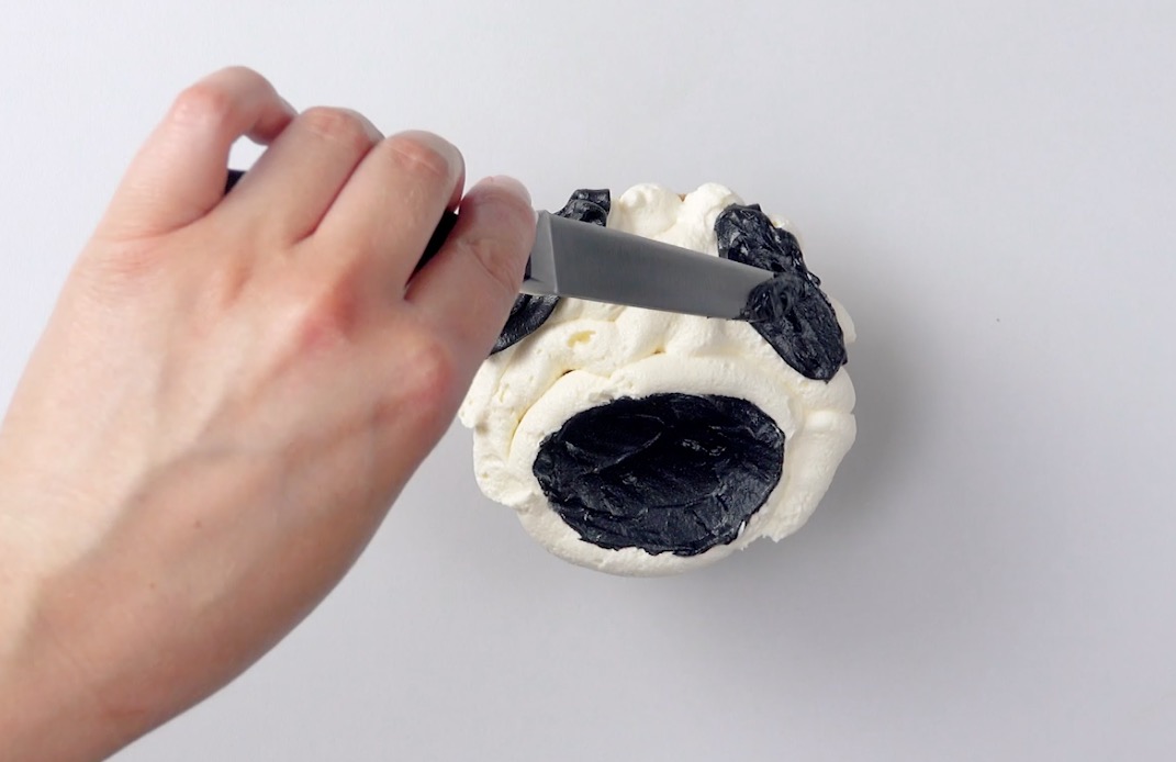 2.) Spritze nun die schwarze Buttercreme auf die freie ovale Fläche und trage zudem etwas kleinere schwarze Ovale links und rechts der Tupfer auf, die du gesetzt hast. Streiche diese „Schnauze“ und „Ohren“ nun mit einem Messer glatt.