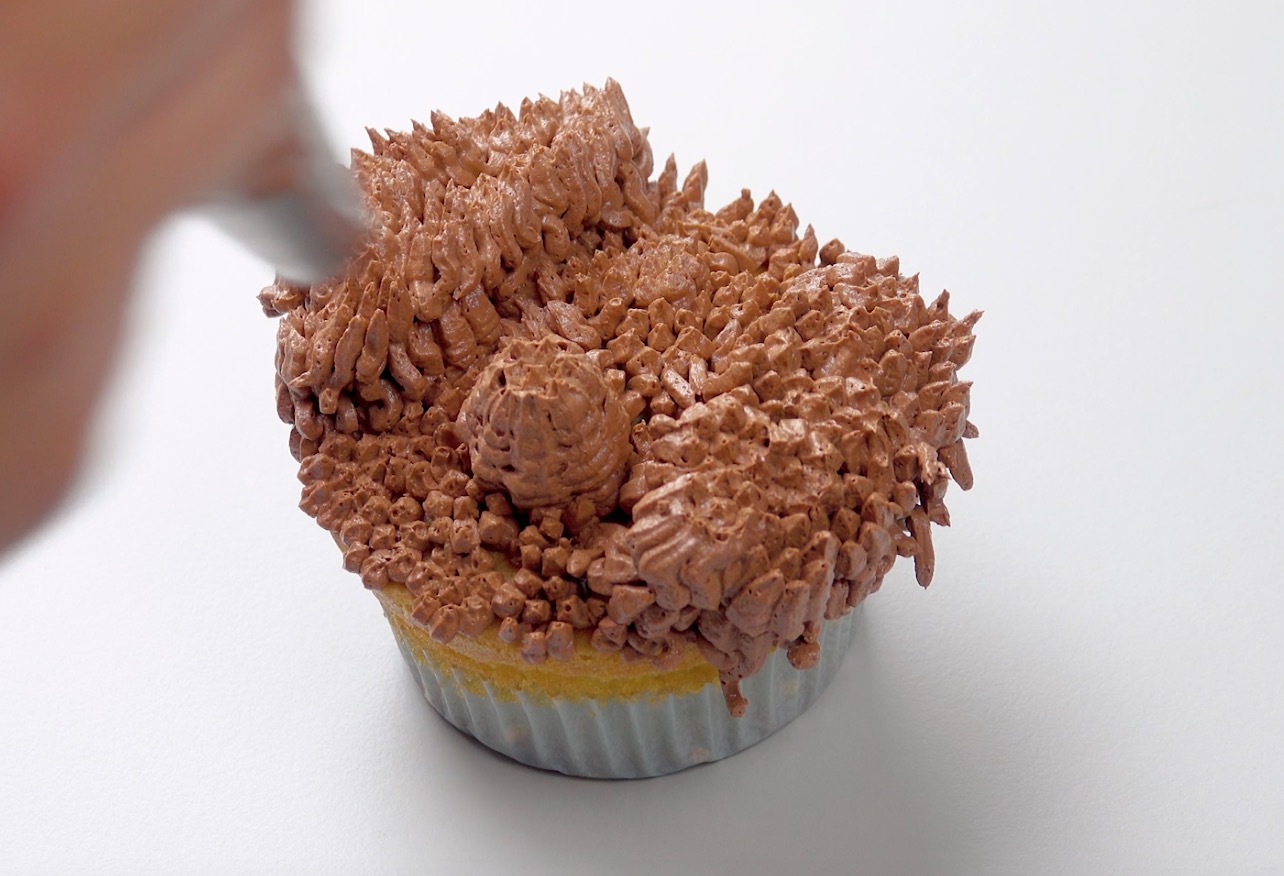 1.) Fülle die Buttercreme in eine Spritztülle mit gezacktem Aufsatz. Mach damit Tupfer auf den ganzen Cupcake. An zwei gegenüberliegenden Seiten spritzt du nun als Ohren 2 Ovale. Dazwischen spritzt du einen Tupfer als Schnauze.
