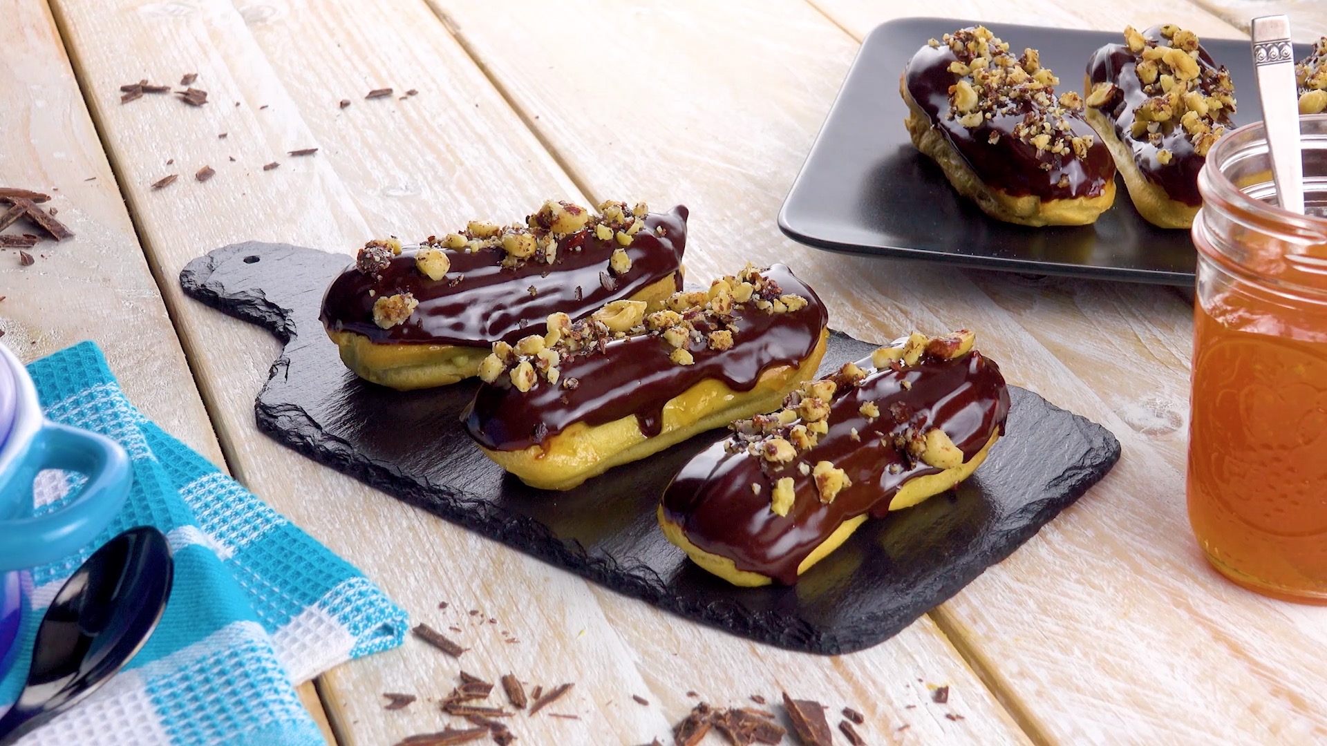 - Zu guter Letzt kannst du die Éclairs noch mit gehackten Haselnüssen garnieren, die du zuvor in Butter und Honig angebraten hast.