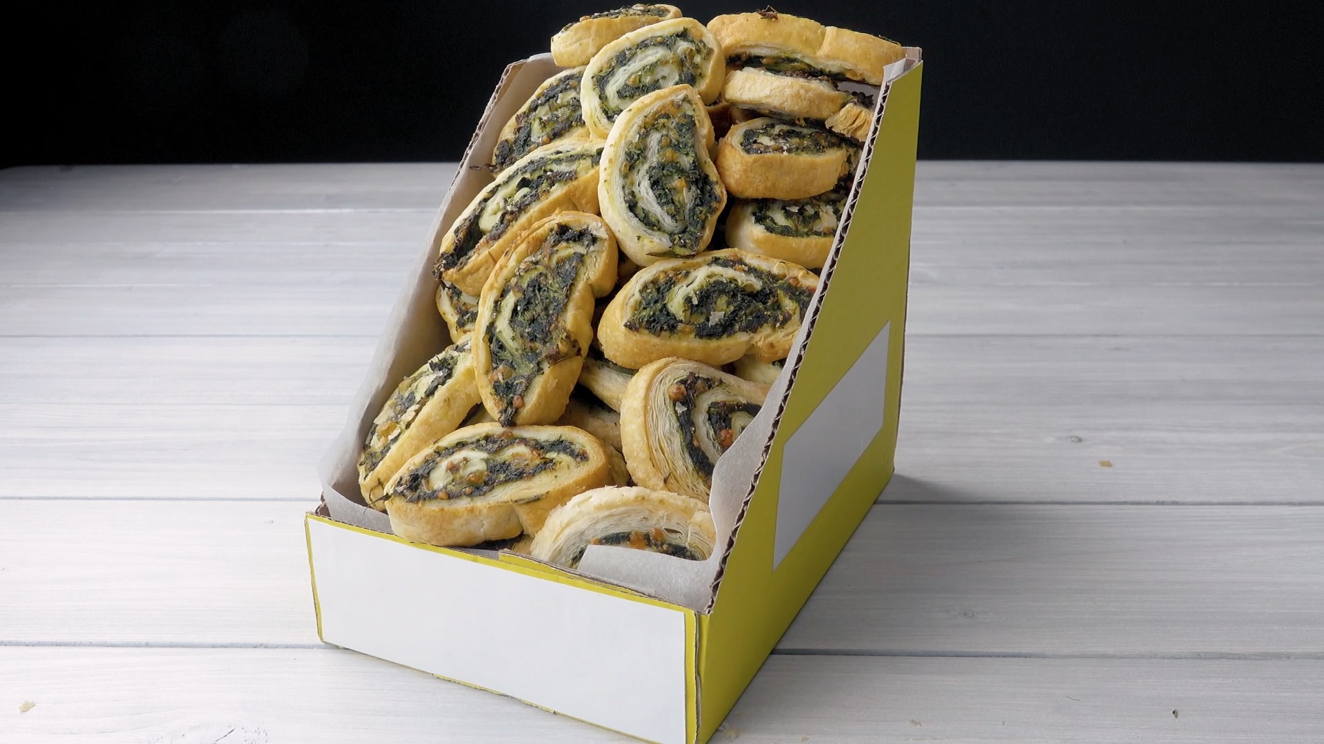 Rolle zunächst den Blätterteig auf deiner Arbeitsfläche aus und bestreiche ihn mit Frischkäse. Gib dann die Spinat-Käse-Mischung darauf und drücke sie etwas fest. Rolle den Teig dann längs ein und schneide die Rolle in etwa 16 Stücke. Die Schnecken werden für 25 Minuten bei 175 °C im Umluft-Modus gebacken.