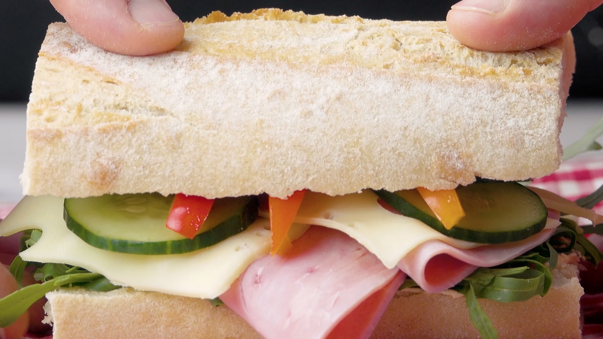 Schneide das Baguette zuerst längs auf und dann je nach gewünschter Größe einen Teil quer ab. Bestreiche die untere Seite davon großzügig mit Frischkäse. Belege das Brot dann mit einer Portion Rucola, dem Schinken, dem Käse, den Gurken und zuletzt den Paprikastreifen. Als Letztes kommt der Brotdeckel darauf.