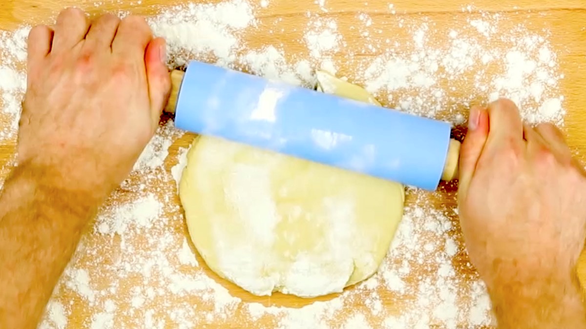 1. Verknete Mehl, Olivenöl, Wasser und Salz zu einem glatten Teig. Teile ihn in zwei Portionen und rolle diese zu großen Kreisen aus.