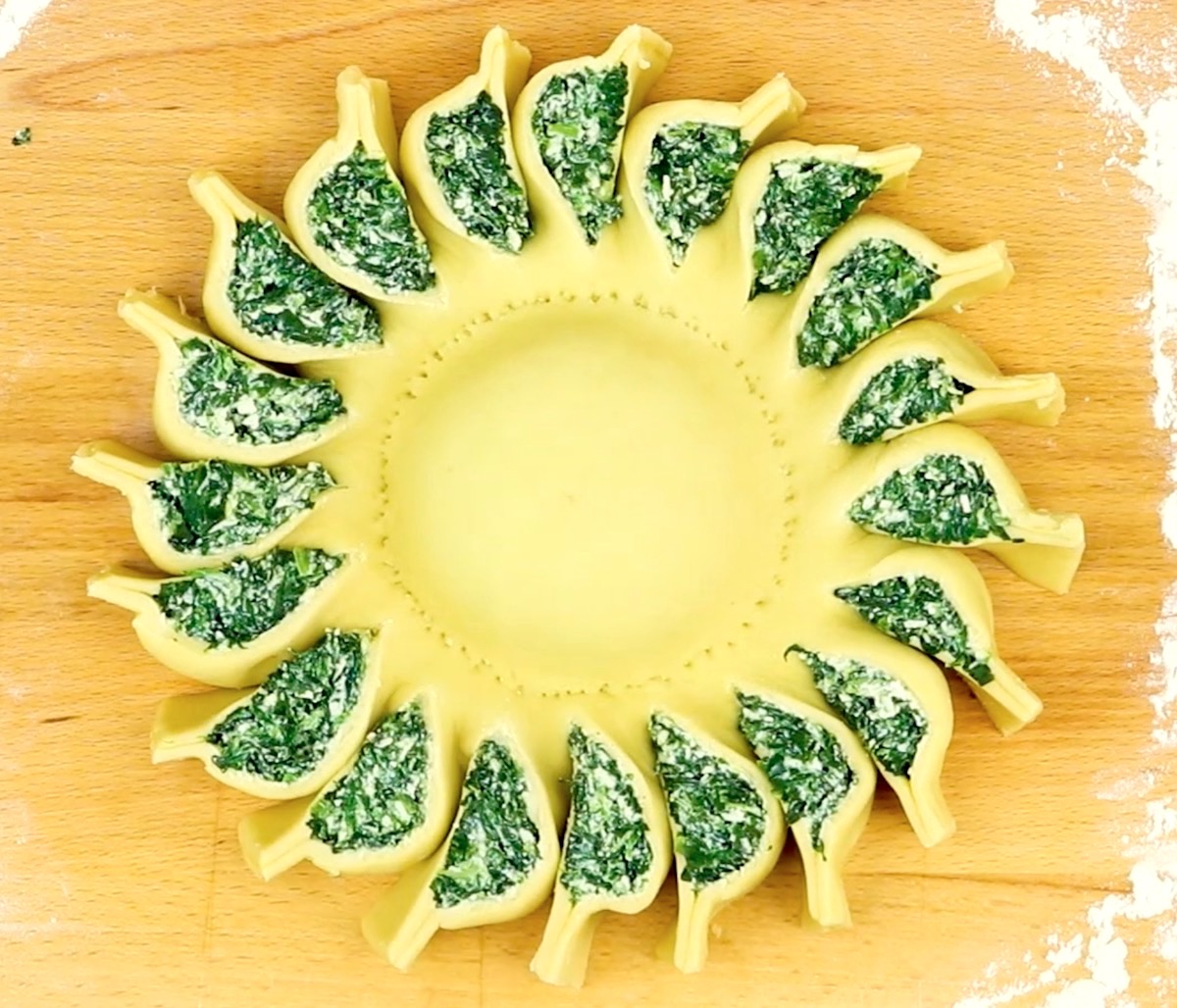 4. Nun schneidest du den gefüllten Teig rundherum gleich tief bis zur Füllung in der Mitte ein. Greife die Stücke und drehe sie so nach oben, dass die Füllung sichtbar wird.