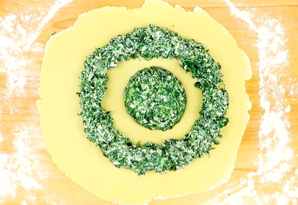 2. Für die Füllung mischst du Spinat, Ricotta, ein Ei, Parmesan, Salz und Pfeffer gut miteinander. Diese Mischung gibst du folgendermaßen auf einen der Teigkreise: eine große Portion genau in die Mitte, den Rest ringförmig um diese herum. Zwischen äußerem Ring und Mitte bleibt dabei etwas Abstand bestehen.