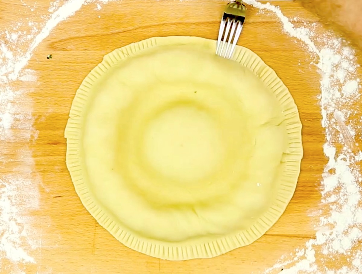 3. Nun bepinselst du die Ränder mit einem Teil des zweiten Eies und legst den anderen Teigkreis darauf. Mit einer Gabel drückst du die Ränder rundherum fest. So entsteht gleichzeitig ein dekoratives Muster.