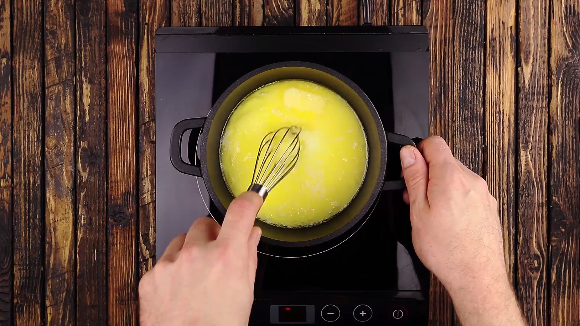 Schmilz die Butter in einem Topf, füge Zucker und Milch zu und erhitze die Zutaten.