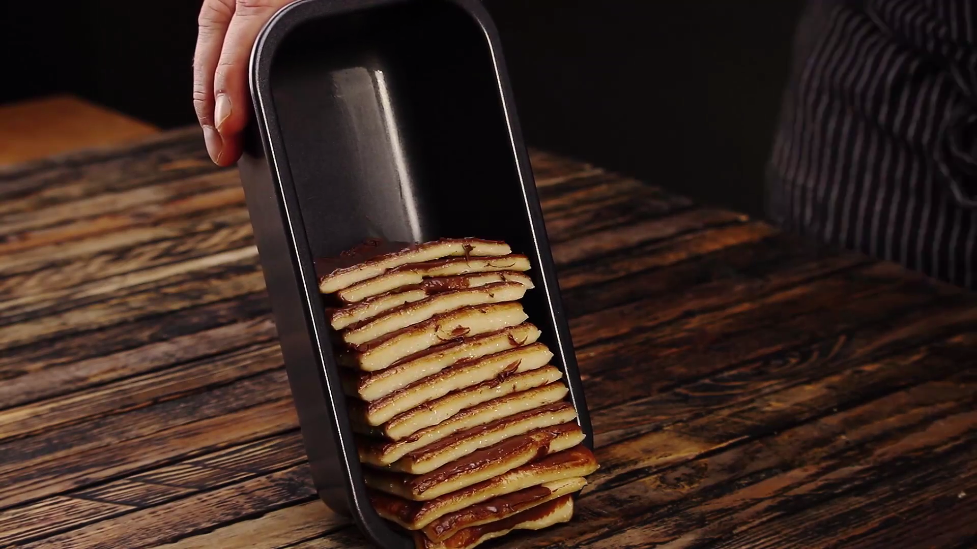 Die Teigquadrate stapelst du hochkant in eine Kastenform. Den Kuchen backst du bei 150 °C für 40 Minuten.