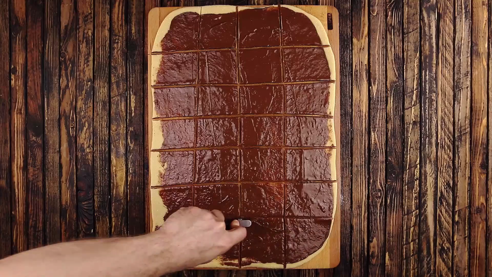 Rolle den Teig flach zu einem Rechteck aus und bestreiche ihn gleichmäßig mit Nutella.