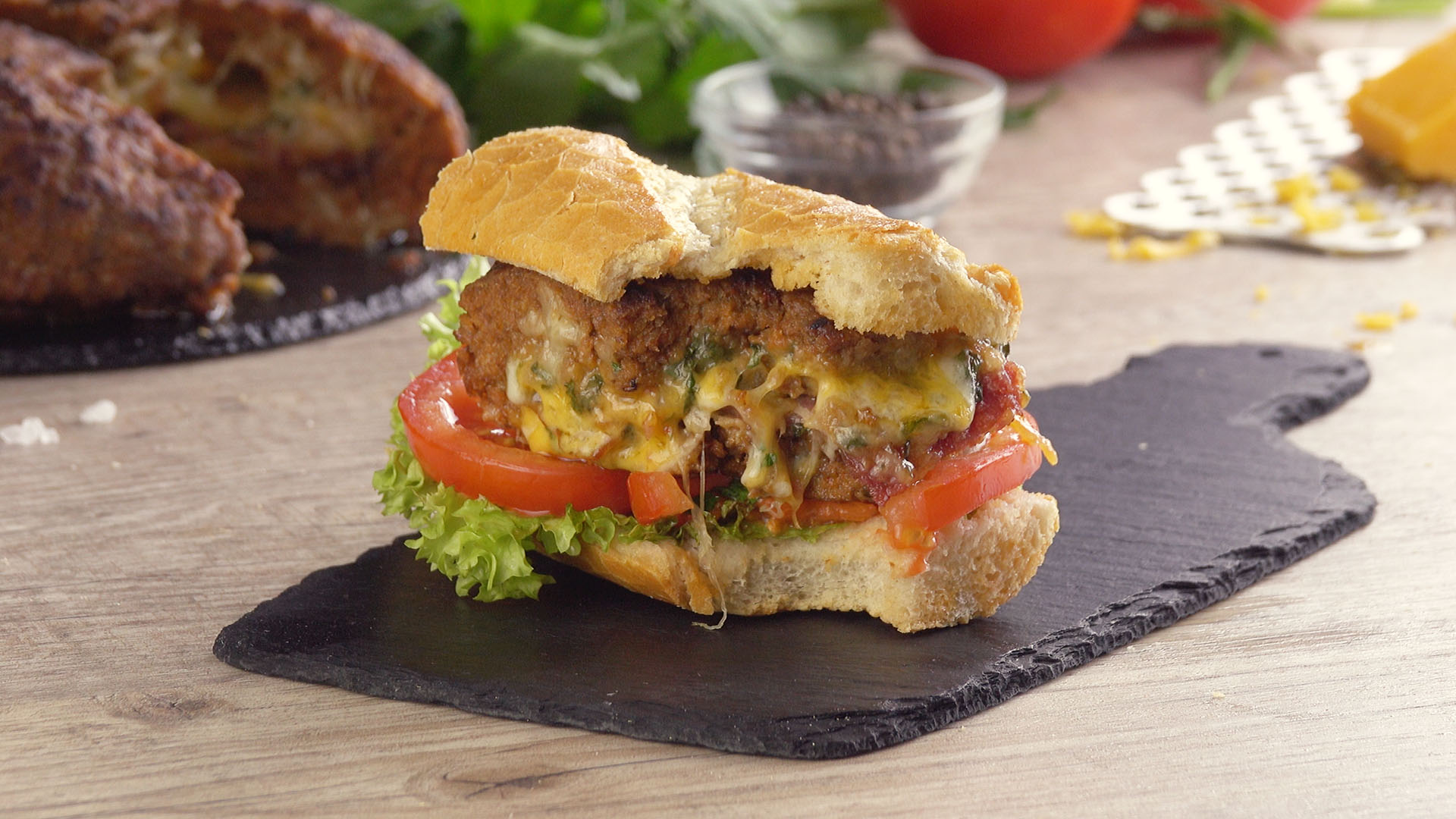 Wenn du nicht nur zum Frühstück Ei liebst, klicke hier in das ganze Rezept für den Burger mit Füllung.