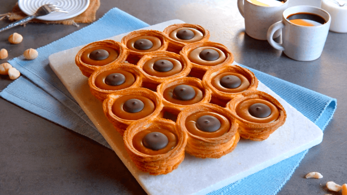 1.4 Gieße Karamellsoße in die gebackenen Teigschälchen und setze auf jede Portion mittig eine Haselnuss. Zum Schluss gibst du noch jeweils ein Schokoplätzchen obendrauf.