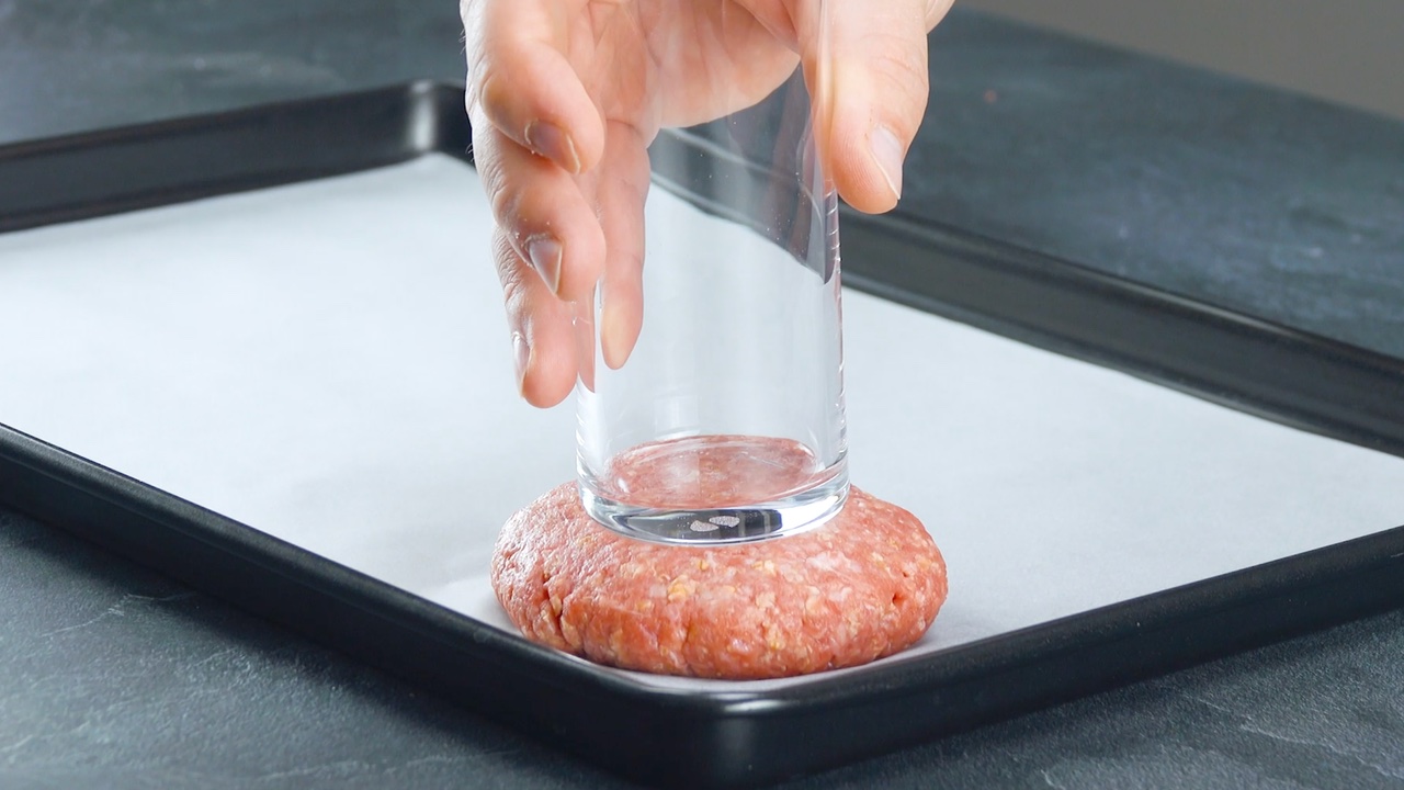 2.2 Drücke nun eine Vertiefung in die Bouletten. Dafür eignet sich der Boden eines Glases besonders gut.