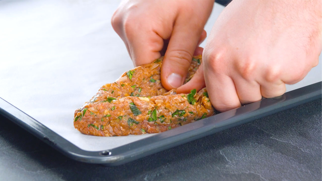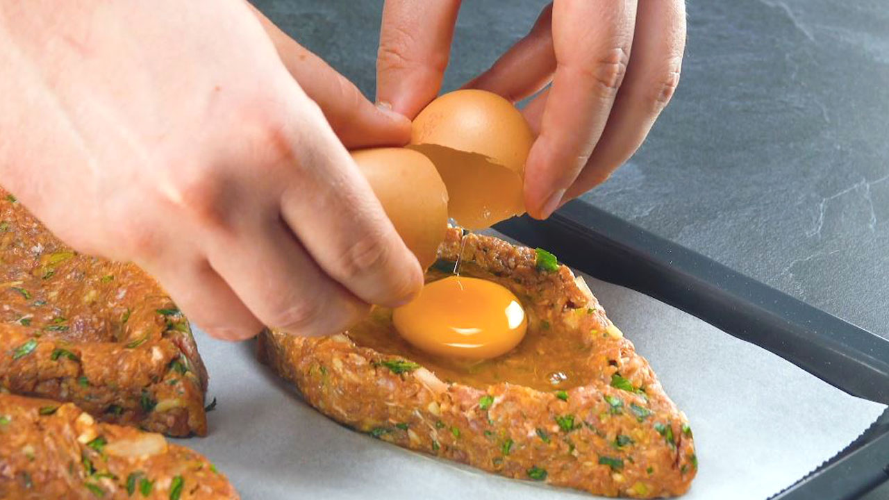 1.2 Forme die Hackfleisch-Masse anschließend zu 5 Booten und lege diese auf ein mit Backpapier ausgelegtes Blech. Drücke dann mit den Fingern eine Vertiefung in die Mitte jedes Hackbootes.