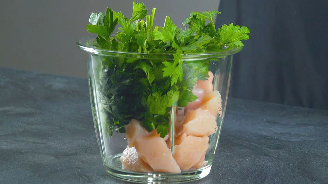 2.3 Nimm dir nun einen Mixer und gib die Hühnerbrust, die Petersilie, den Käse, die Knoblauchzehen und die Sahne hinein, um die Füllung deiner Bouletten herzustellen.