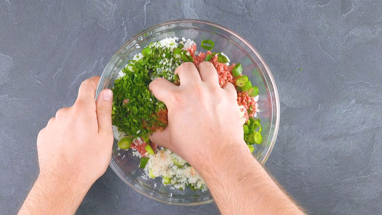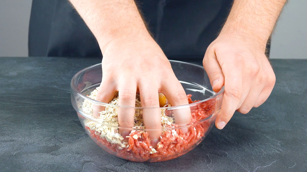 1.1 Gib das Hackfleisch und die restlichen Zutaten nacheinander in eine Schüssel und verknete alles gut miteinander.