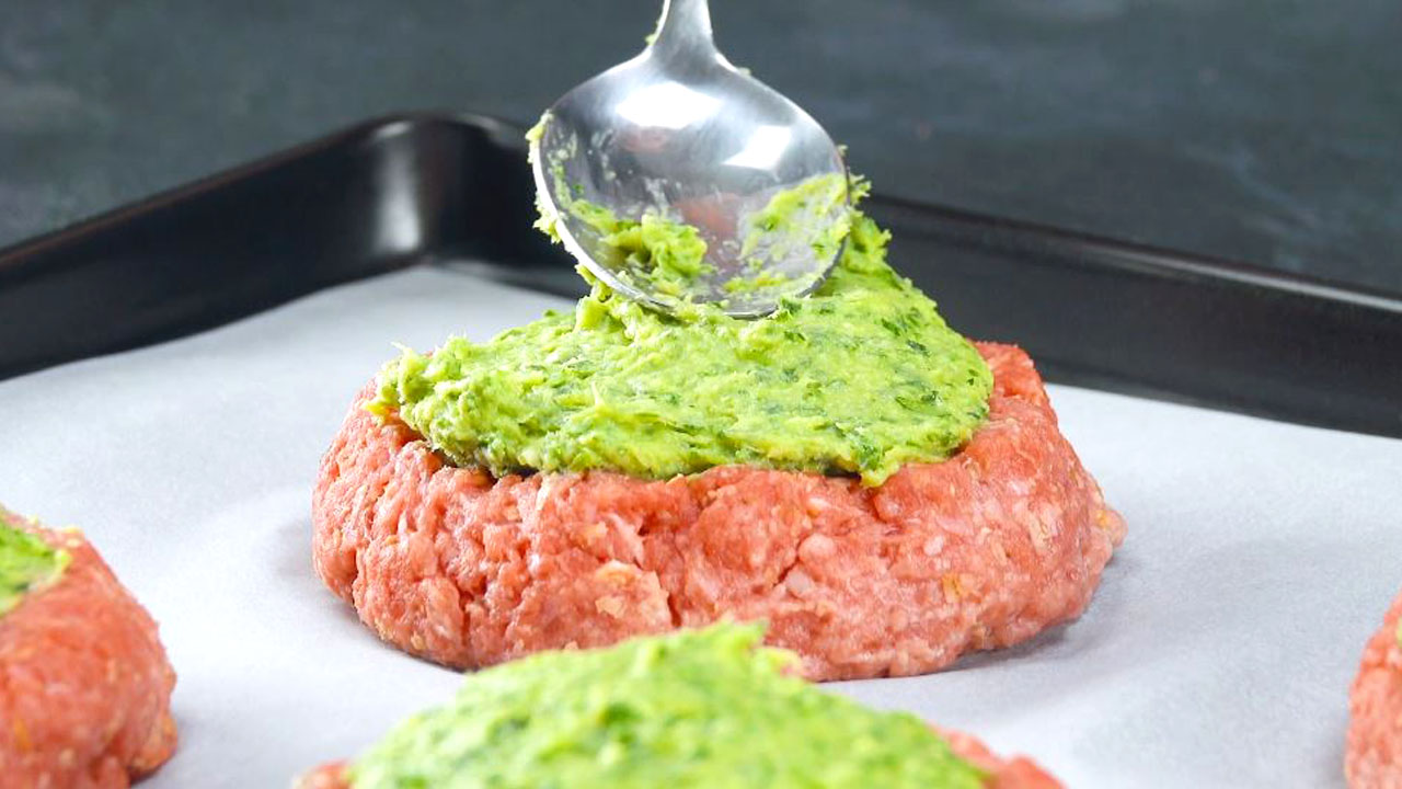 2.4 Gib dann jeweils 1-2 Esslöffel der Hühnerbrust-Petersilien-Masse in die Kuhlen der Bouletten und streiche sie glatt.