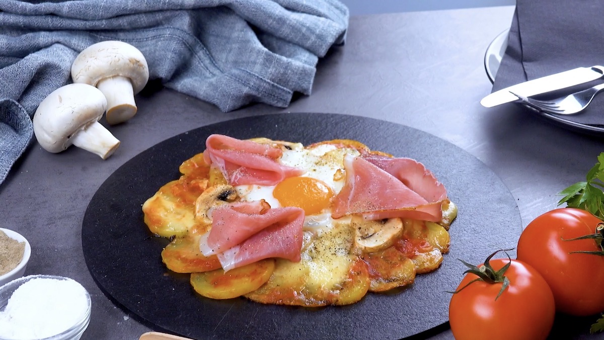 Das ist mal eine Pizza, wie sie die Welt noch nicht gegessen hat: ein Boden aus Kartoffeln, bestrichen mit Tomatensoße sowie mit Pilzen, Schinken, Mozzarella und Parmesan belegt. Allein das Spiegelei verrät auf den ersten Blick, dass es sich hierbei um ein ganz besonderes Gericht handelt.
