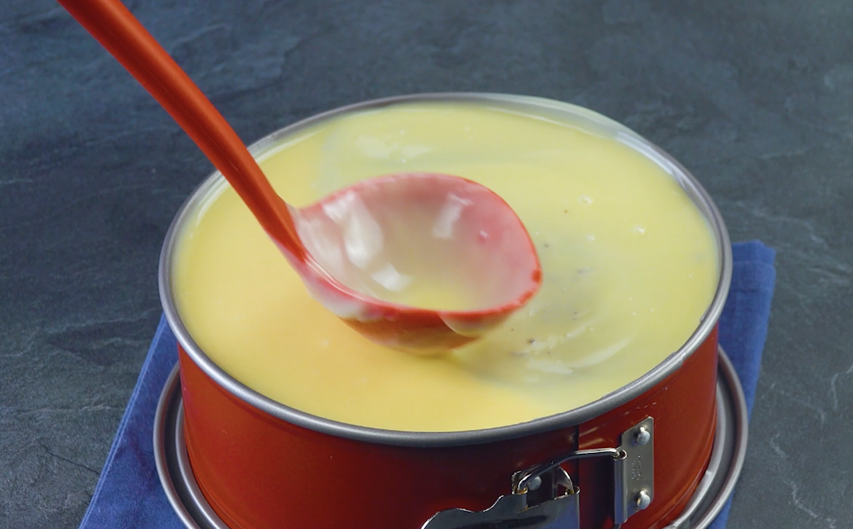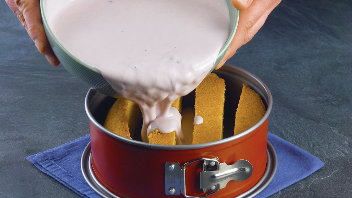 2.3 Schneide den Kuchen in 4 gleich dicke Scheiben und lege diese in gleichmäßigen Abständen in eine Springform. Fülle die Zwischenräume in der Springform mit der Blaubeercreme und stelle den Kuchen für 2 Stunden in den Kühlschrank.