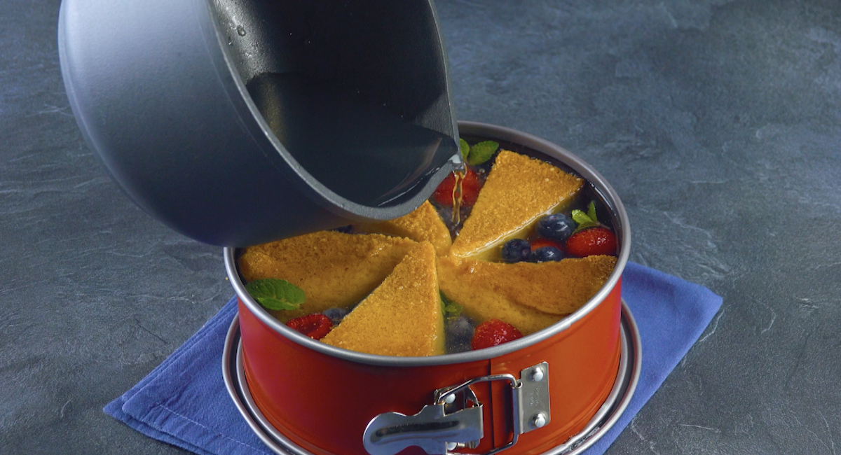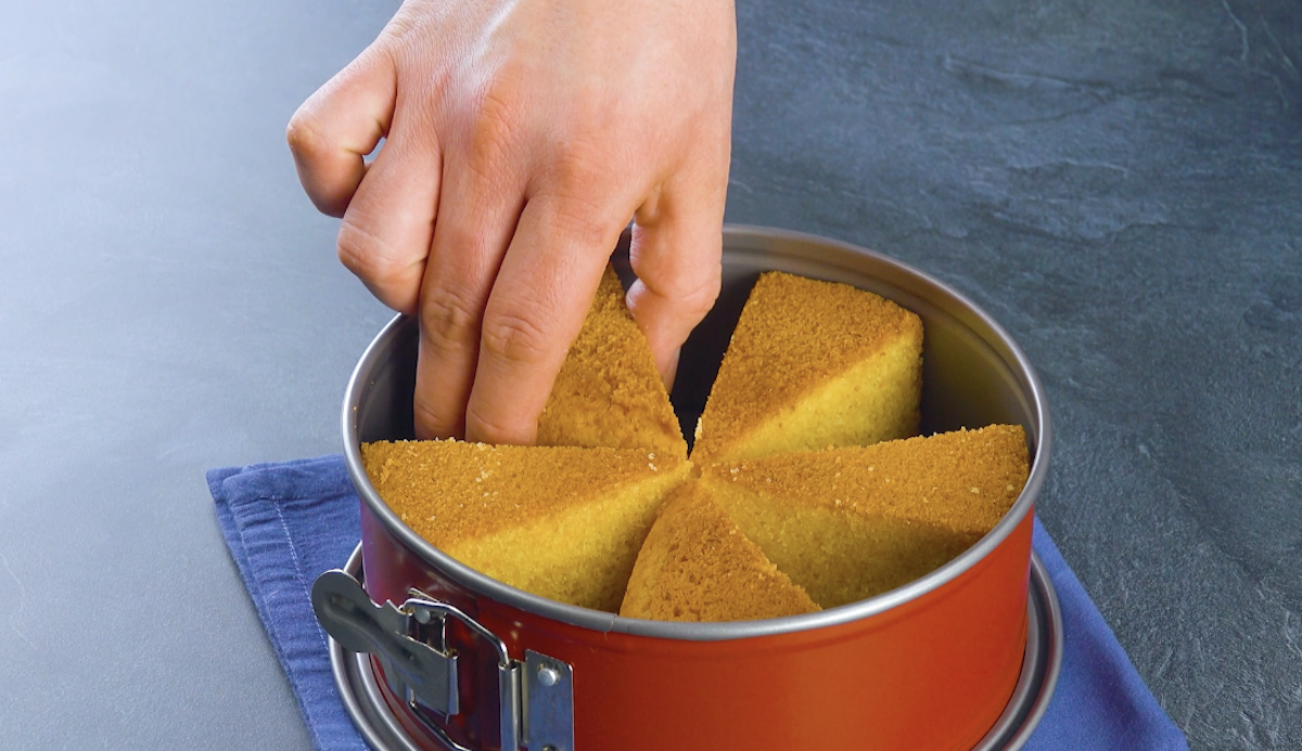 3.2 Schneide den Kuchen in 5 Dreiecke und stelle diese in gleichmäßigen Abständen in eine Springform (am besten dichtest du die Springform auf dem Boden mit Frischhaltefolie ab).