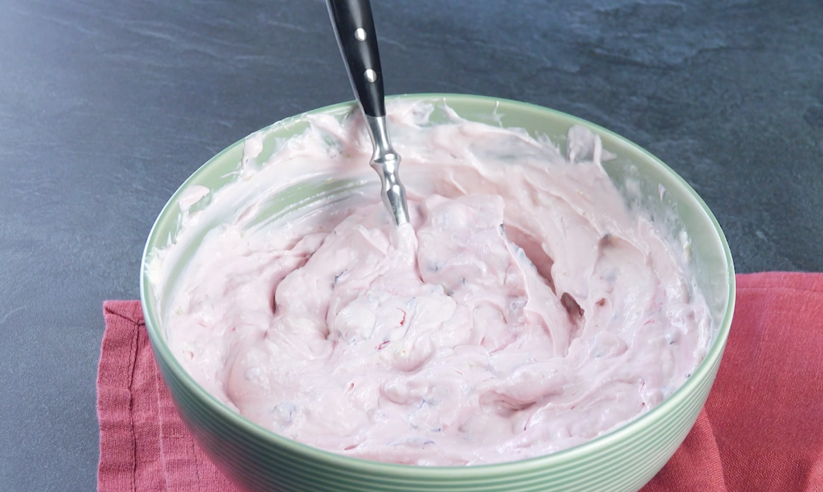 2.2 Erwärme die Sahne mit der zuvor in kaltem Wasser eingeweichten Gelatine und stelle sie zum Abkühlen erst einmal beiseite. Vermische die Blaubeeren mit Frischkäse und Puderzucker und zerdrücke dabei die Beeren mit einer Gabel. Gib dann die abgekühlte Sahne hinzu und verrühre alles miteinander.