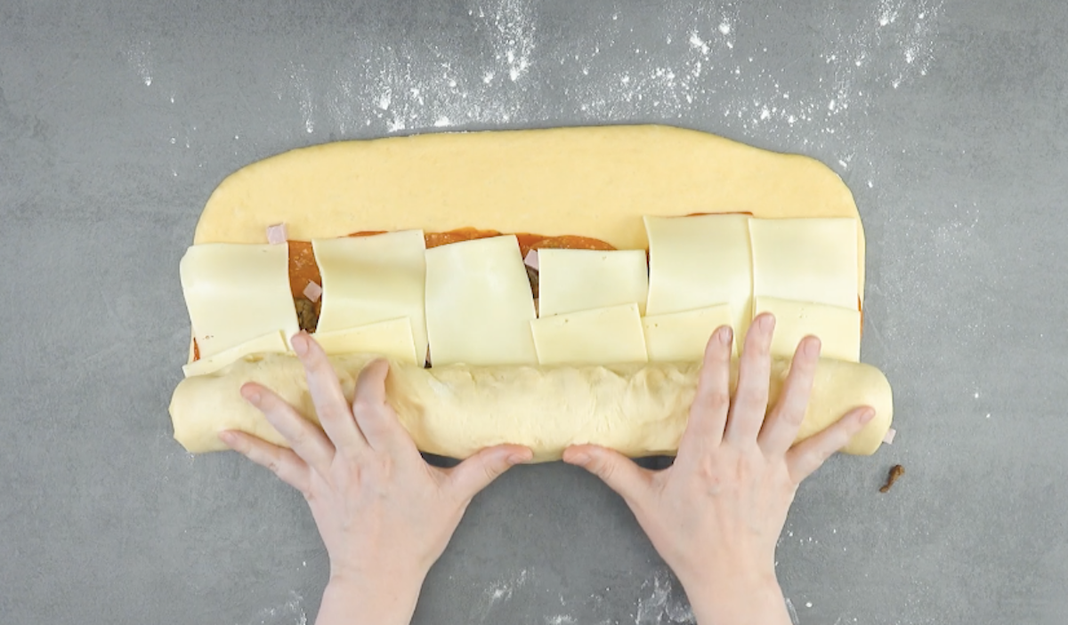 1.3 Belege die Tomatensoße mit Salami, gebratenem Hackfleisch, Schinkenwürfeln und Käse. Rolle alles von unten nach oben zusammen.
