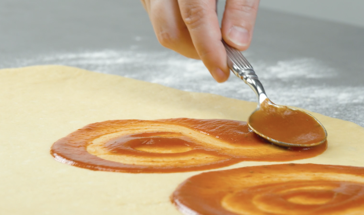 1.2 Bestreiche den Teig mit Tomatensoße, lass aber oben einen Rand von ca. 4-5 cm Breite frei.