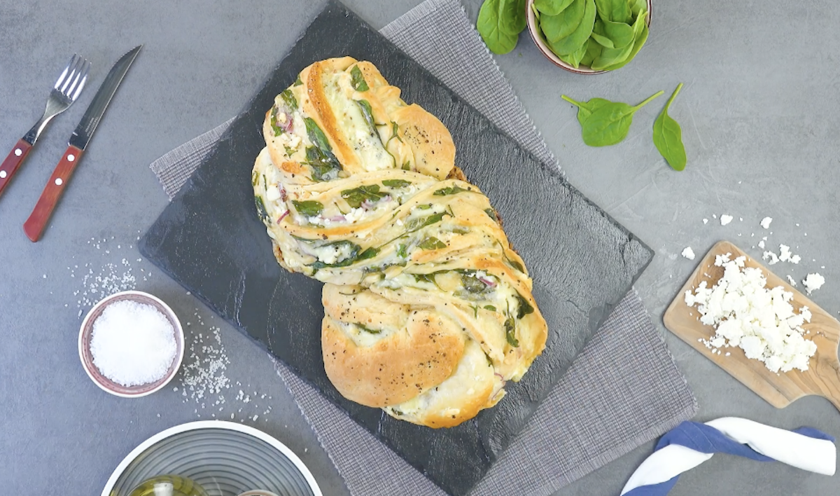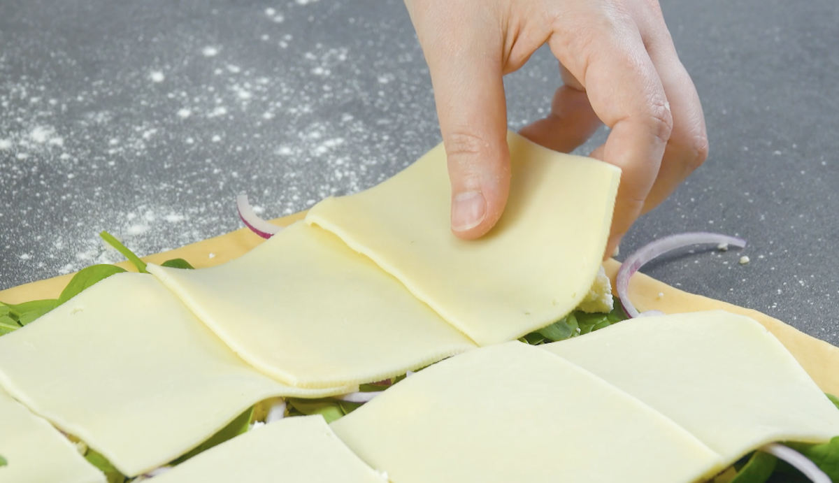 2.2 Belege den Teig mit Babyspinat, Feta, Zwiebeln, Knoblauch sowie Käse und lass oben wieder 4-5 cm bis zum Rand frei.