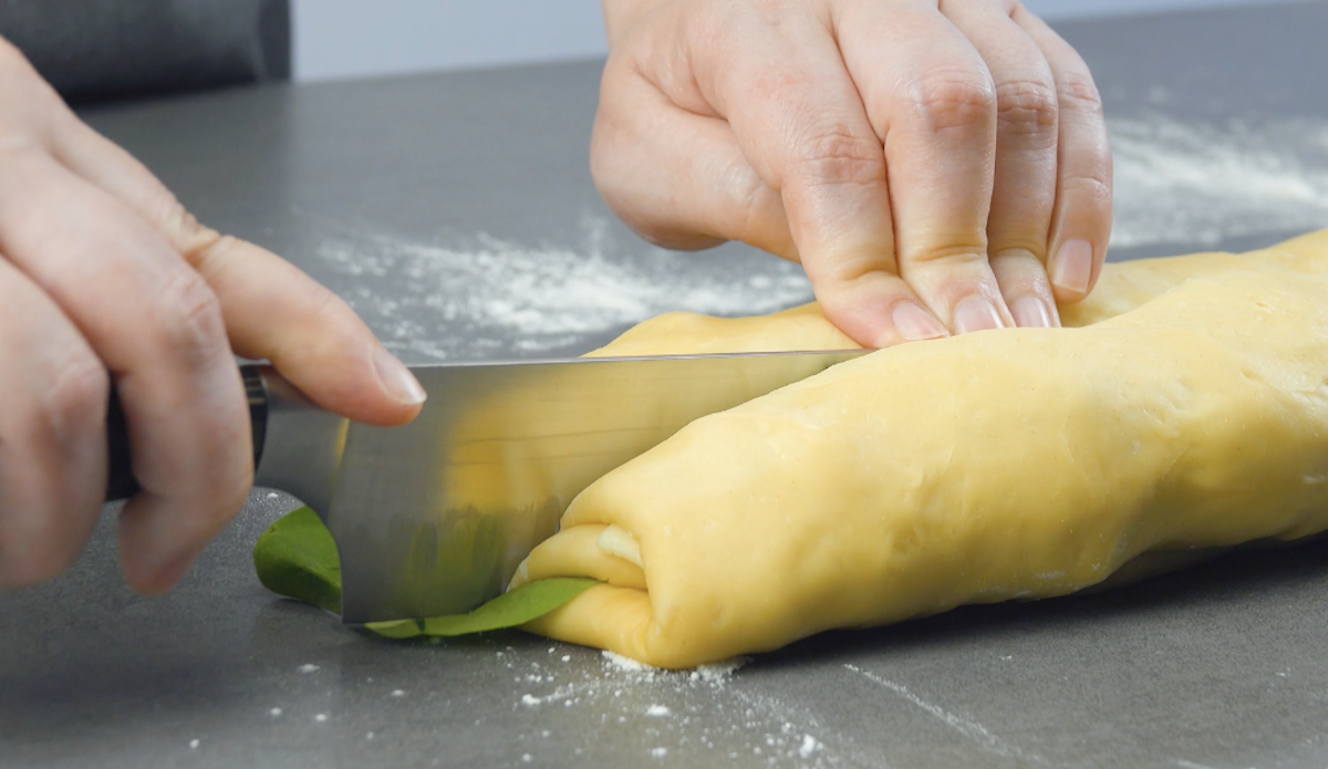 Tipp: Bevor du die Teigrolle halbierst, stelle sie am besten ca. 45 Minuten in den Kühlschrank, dann lässt sie sich besser durchschneiden.