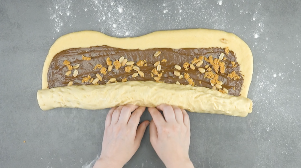 3.2 Bestreiche den Teig mit Nutella und verteile darauf Erdnüsse und zerbröselte Karamellbonbons. Lass oben wieder 4-5 cm bis zum Rand frei und rolle den Teig zusammen.