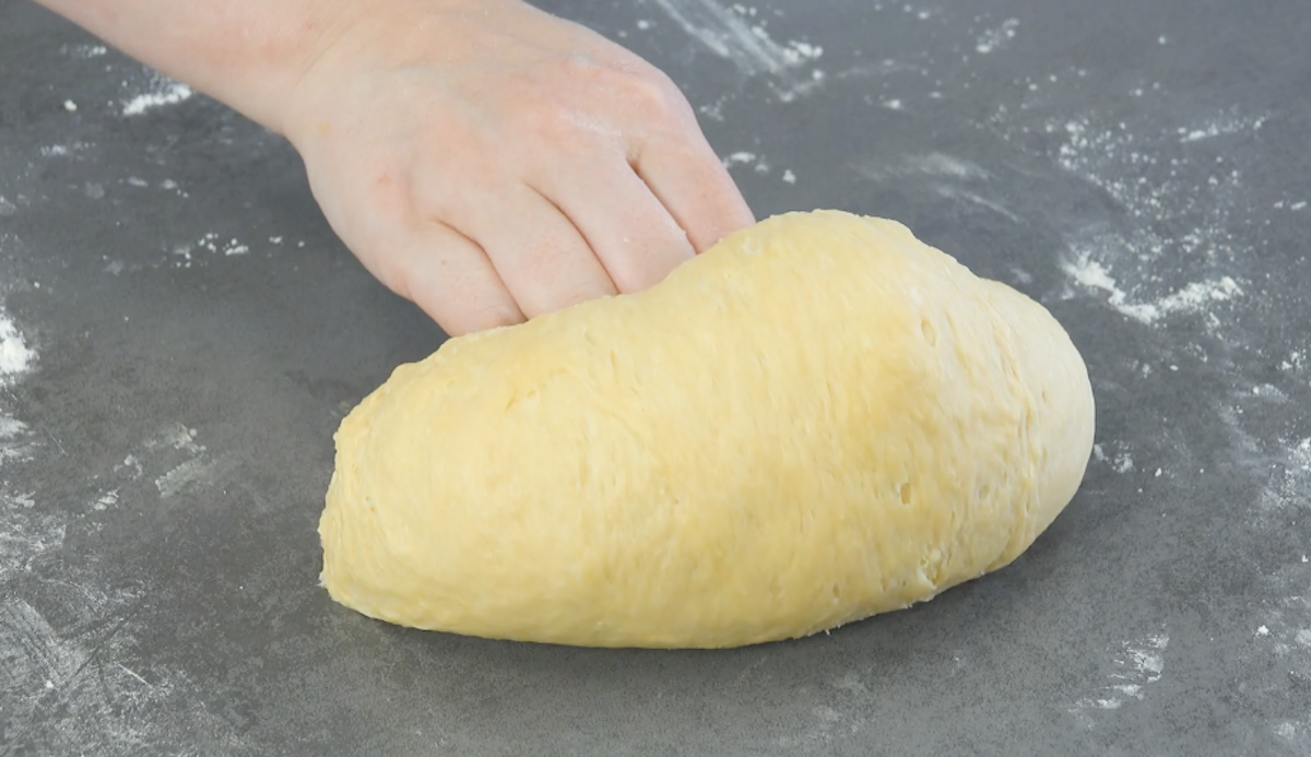 2.1 Forme den Teig auf einer bemehlten Arbeitsfläche zu einer Kugel und rolle ihn dann auf ca. 50 x 40 cm aus.
