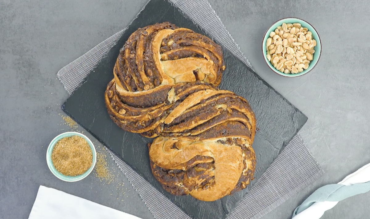 3.3 Halbiere die Rolle der Länge nach, verzwirble die beiden Teigstränge miteinander und lege sie s-förmig auf ein mit Backpapier ausgelegtes Backblech. Bestreiche den Teig mit flüssiger Butter und schiebe das Blech bei 175 °C Ober- und Unterhitze für 40 Minuten in den Ofen.