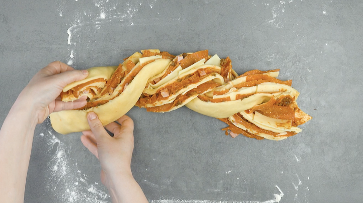 1.4 Halbiere die Rolle der Länge nach und verknote die beiden Teigstränge miteinander.