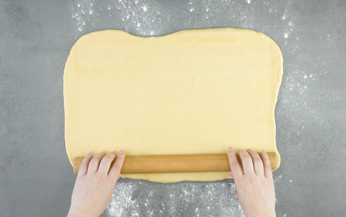 3.1 Forme den Teig auf einer bemehlten Arbeitsfläche zu einer Kugel und rolle ihn dann auf ca. 50 x 40 cm aus.