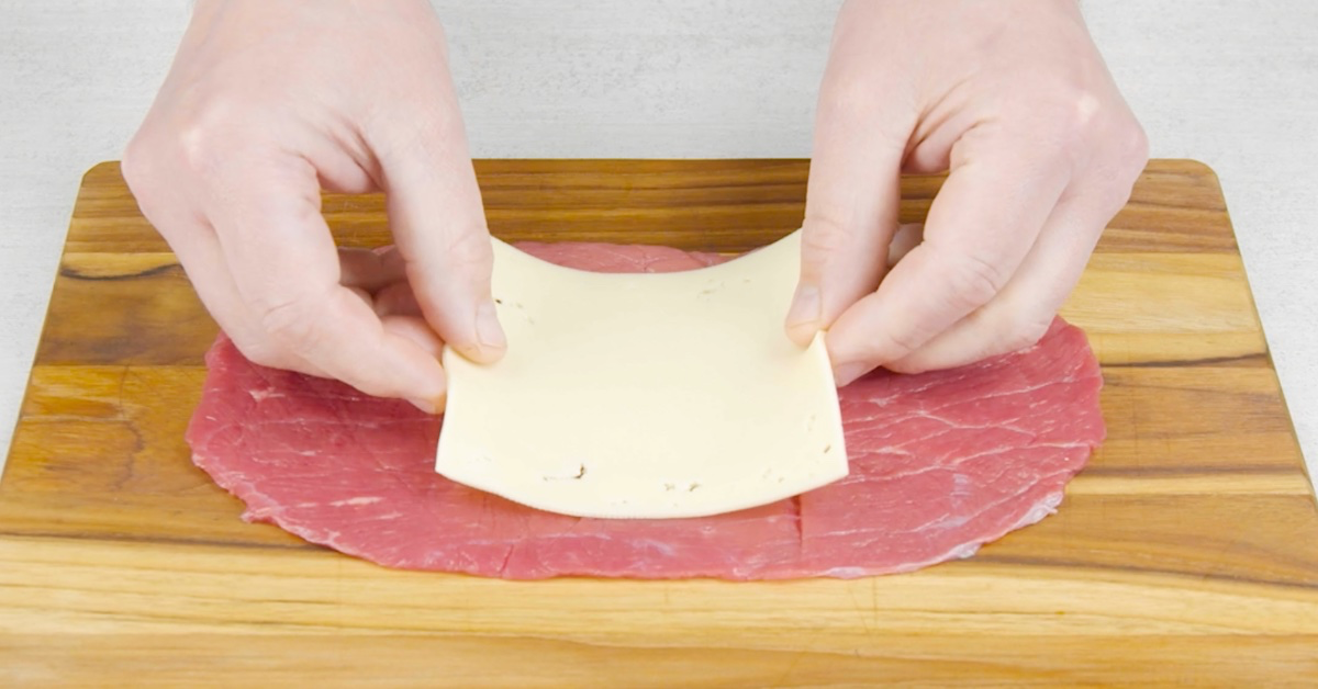 3.1 Lege zunächst das Rindfleisch flach auf eine Unterlage und platziere die Käsescheibe mittig obendrauf.