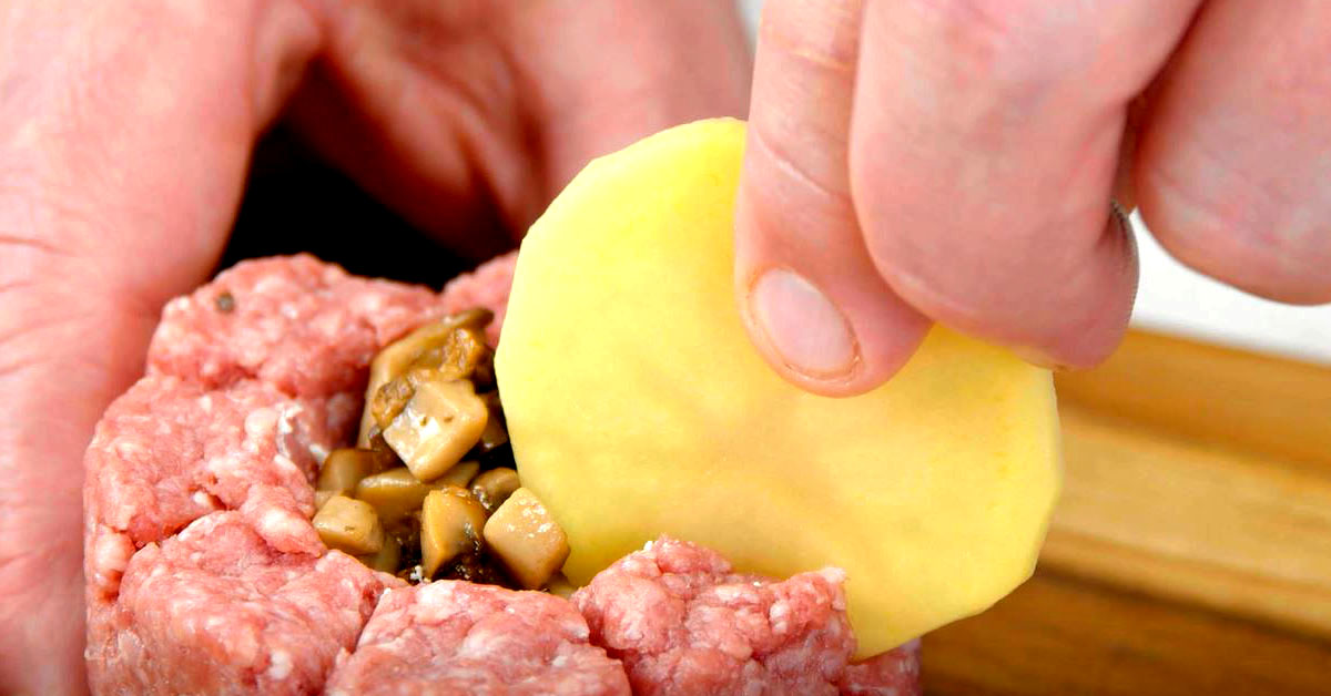 2.3 Stecke nun die Kartoffelscheiben schräg in den Rand des Hackfleisches.