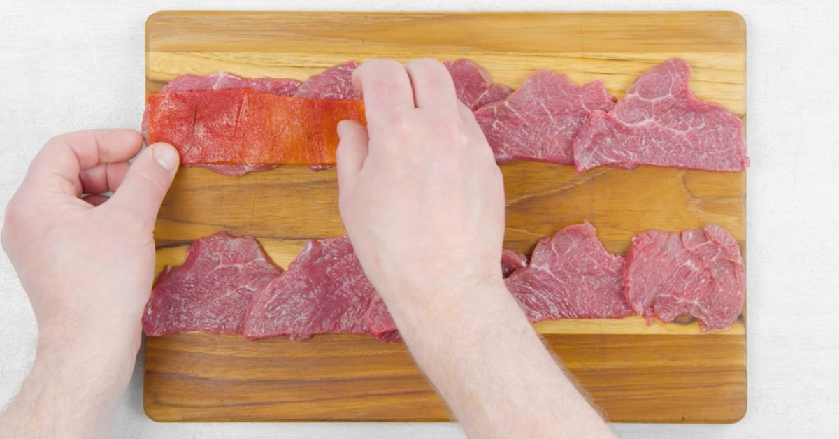 1.1 Lege die Rindfleischstreifen überlappend in zwei Reihen auf deine Arbeitsplatte. Garniere das Fleisch dann mit den Paprikastreifen.