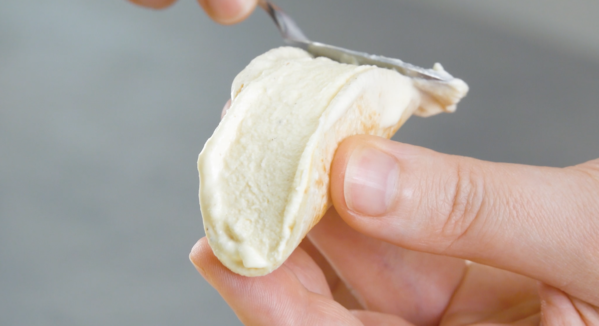 3.3 Warte kurz, bis die Tacos abgekühlt sind. Fülle sie dann mit Vanilleeis und stelle sie nochmals für 1 Stunde in den Gefrierschrank.