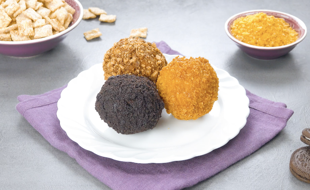 2.3 Entferne die Frischhaltefolie von den Eiskugeln. Wälze das Eis dann zuerst im Eiweißschaum und dann in einer der drei zerbröselten Panaden, und zwar: das Erdbeereis in den Oreo-Krümeln, das Schokoladeneis in den Cornflakes-Krümeln und das Vanilleeis in den Cini-Mini-Krümeln.
