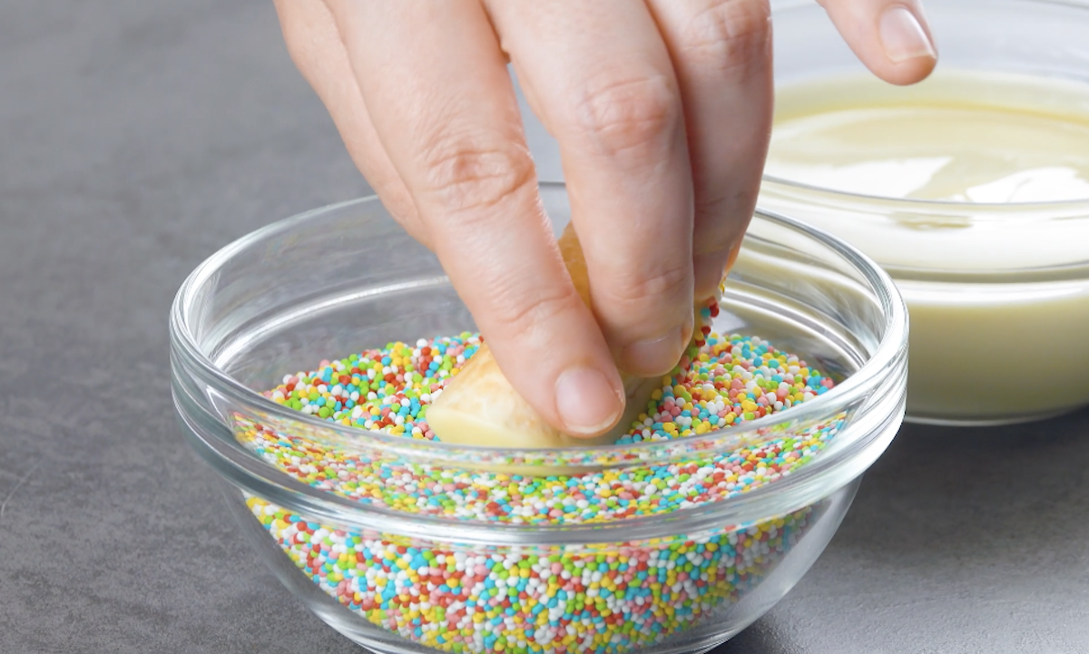 3.5 Tunke die Hälfte der gefrorenen Eis-Tacos in die weiße geschmolzene Schokolade und wälze sie in Zuckerperlen.