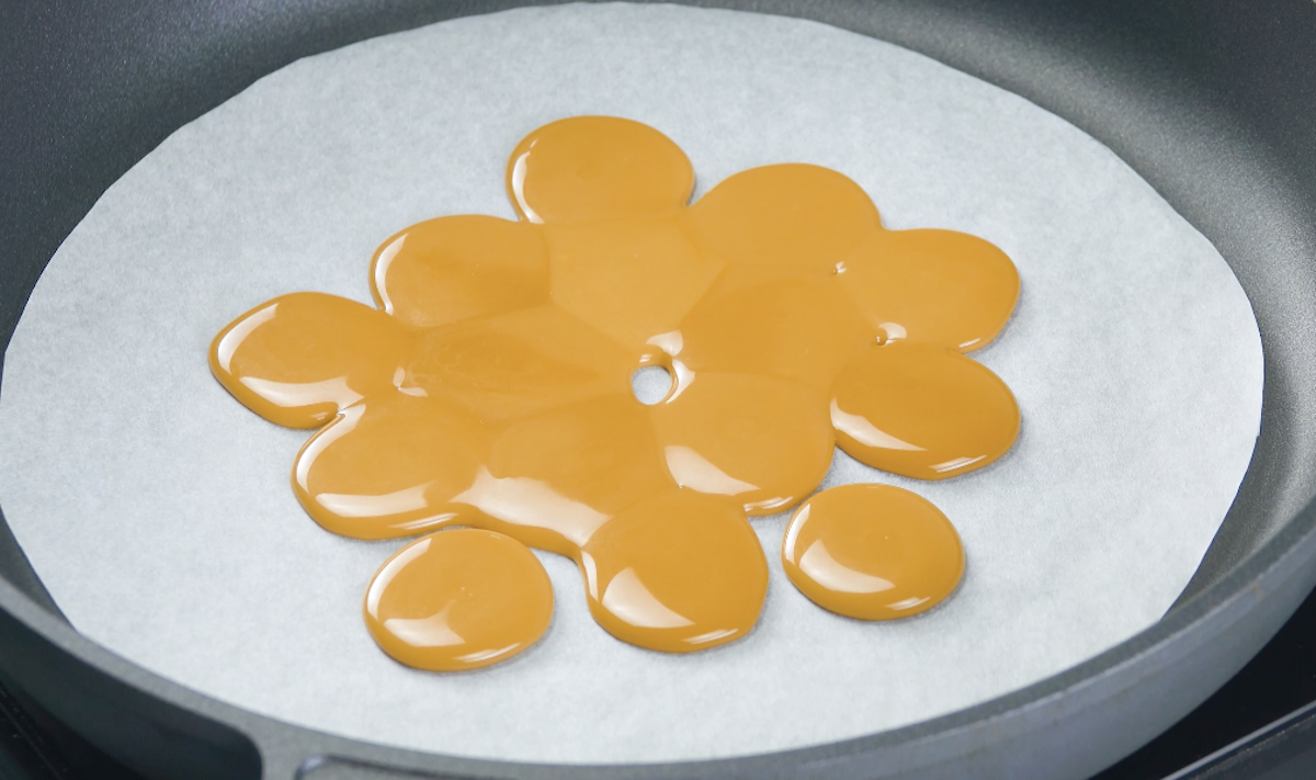 1.1 Lege die Pfanne mit Backpapier aus, platziere in der Mitte 15 Karamellbonbons und bringe diese bei geringer Hitze zum Schmelzen.