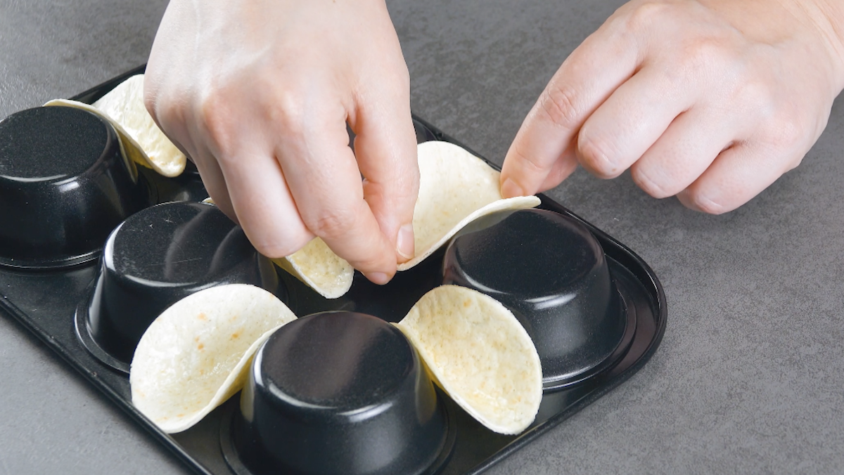 3.1 Stich aus einer großen Tortilla 7 gleich große Kreise aus. Bepinsle diese mit flüssiger Butter und stecke sie in die Zwischenräume einer umgedrehten Muffinform.